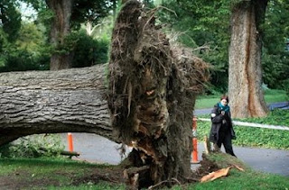 I wonder if it has anything to do with this: "Ozone-killed tissues are readily infected by certain fungi" - Alabama Cooperative Extension... or this: "Possible impacts of ozone on forest species include reduced growth and vigor, reduced seed production, and increased susceptibility to insects and disease." - USDA Forest Service This is actually a painting of an elm, from 1821, by Constable! Over time, trees evolved along with the rest of the millions of species in a complex, balanced web of symbiotic relationships. Then all the sudden, after we infect the atmosphere with toxic gases and distort the balance, lo and behold, the trees start to succumb to one plague after the other - insects, fungus, and bacteria. Seriously - there's no connection? For some random reason, the insects and fungus and disease have just run amuck and are driving trees to extinction? Here's a little bit about the American chestnut blight, first detected in 1904. Within 40 years it had decimated the population...nearly 4 billion trees had been killed. "Mature trees often grew straight and branch-free for 50 feet (sometimes up to one hundred feet), and could grow up to 200 feet tall with a trunk diameter of 14 feet at a few feet above ground level." It is inconceivable how much has been lost, and one reason I am doubtful we can survive. How creepy is it that this photo in Wiki is labeled "Cankers caused by the fungal infection cause the tree trunk to split." when I have posted innumerable examples of "BALDing" - Bark Atrophy Lichen Decline" which can now be found on ALL species of trees, along with splitting bark and spectacularly enormous cankers?? Thanks to Desdemona Despair for that link, where another can be found to Canadian wildfires which are so extensive now that the air far away is dangerous to breathe. These are going to become so much more common, everywhere, as trees die - and they will far outpace the capability of existing firefighting infrastructure. They will menace the suburbs, and insurance companies will be unable to fulfill the claims. This photo is from Australia, a 160 year old oak that fell over in April 2008. This photo is from 1956... a Michigan elm, known as Buckley, over 300 years old, which was diagnosed with DED in 2000. 23.5 feet in circumference, 112' tall, a crown 115' across. |