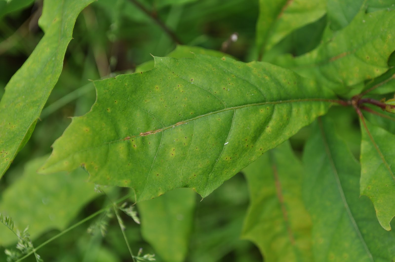 It became impossible to ignore the fact that leaves are exhibiting signs of exposure to pollution, even this early, and so after I got home I took a series of photographs of random examples around Wit's End.