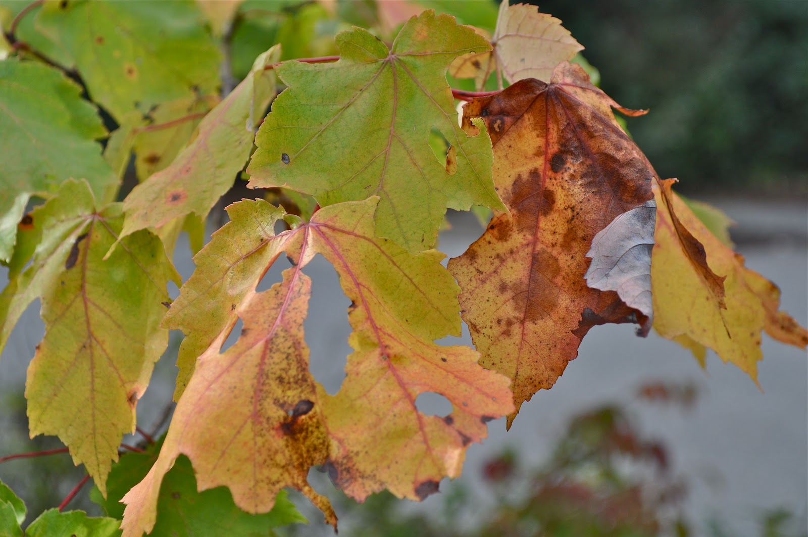 They look speckled, stippled, bronzed and burnt. By the end of the growing season - now - many of them have shriveled up and turned brown. The ground is littered with them already.