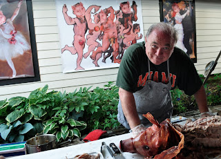 This is just as well because the Pig Roast - despite the effort middle daughter and I put into making murals of dancing pigs by Monet, Degas and Pig-asso - has been discontinued until further notice. It is the end of an era...among the first of many downfalls the privileged can anticipate. I know most of the pictures from this event are just my friends and family, but I like them, so there they are - oh, and the food! We are all going to miss the food...