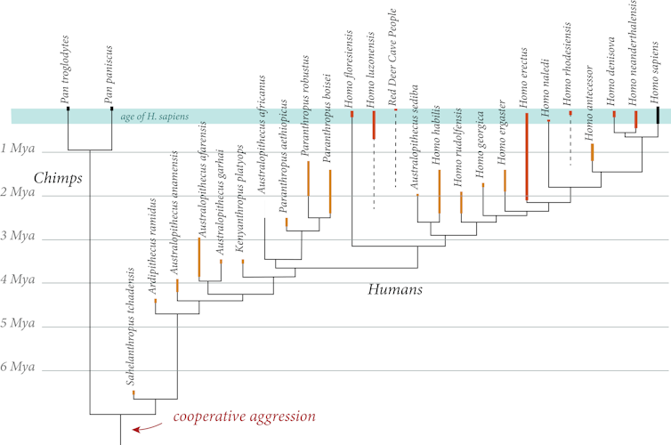 By 10,000 years ago, they were all gone. The disappearance of these other species resembles a mass extinction. But there’s no obvious environmental catastrophe – volcanic eruptions, climate change, asteroid impact – driving it. Instead, the extinctions’ timing suggests they were caused by the spread of a new species, evolving 260,000-350,000 years ago in Southern Africa: Homo sapiens.