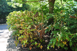 Not surprising considering the cause is tropospheric ozone, the young trees are faring no better. This flowering ornamental is completely dead and the one just beyond has hardly any leaves left.